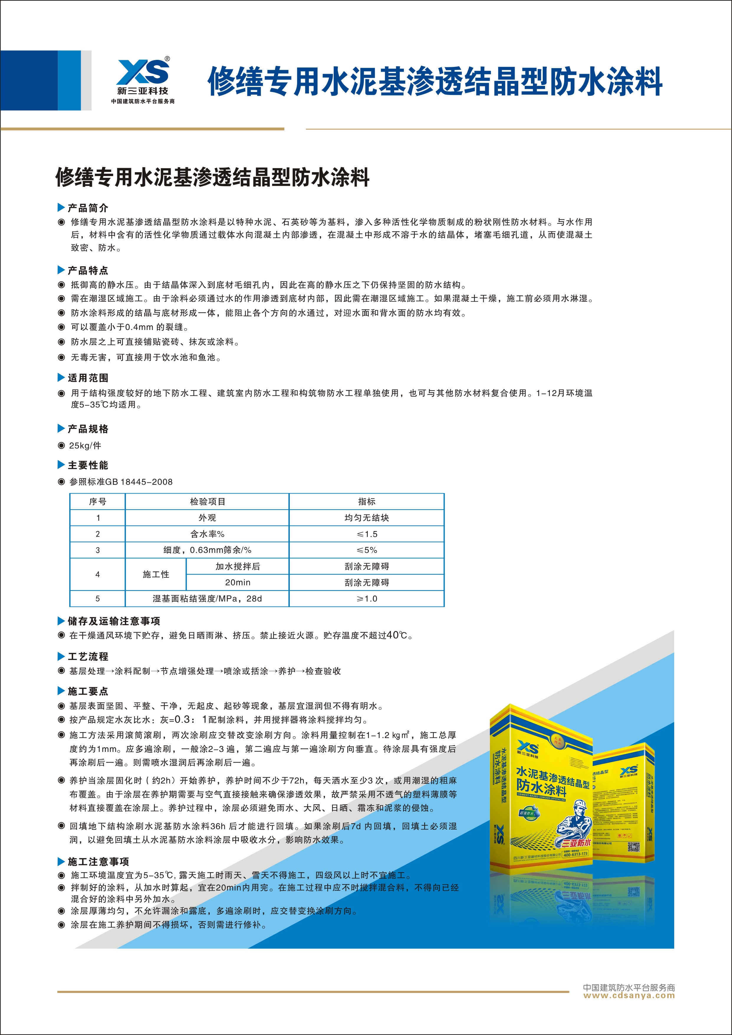 修繕專用水泥基滲透結(jié)晶型防水涂料是以特種水泥、石英砂等為基料,滲入多種活性化學(xué)物質(zhì)制成的粉狀剛性防水材料。與水作用后,材料中含有的活性化學(xué)物質(zhì)通過載體水向混凝土內(nèi)部滲透,在混凝土中形成不溶于水的結(jié)晶體,堵塞毛細(xì)孔道,從而使混凝土致密、防水。