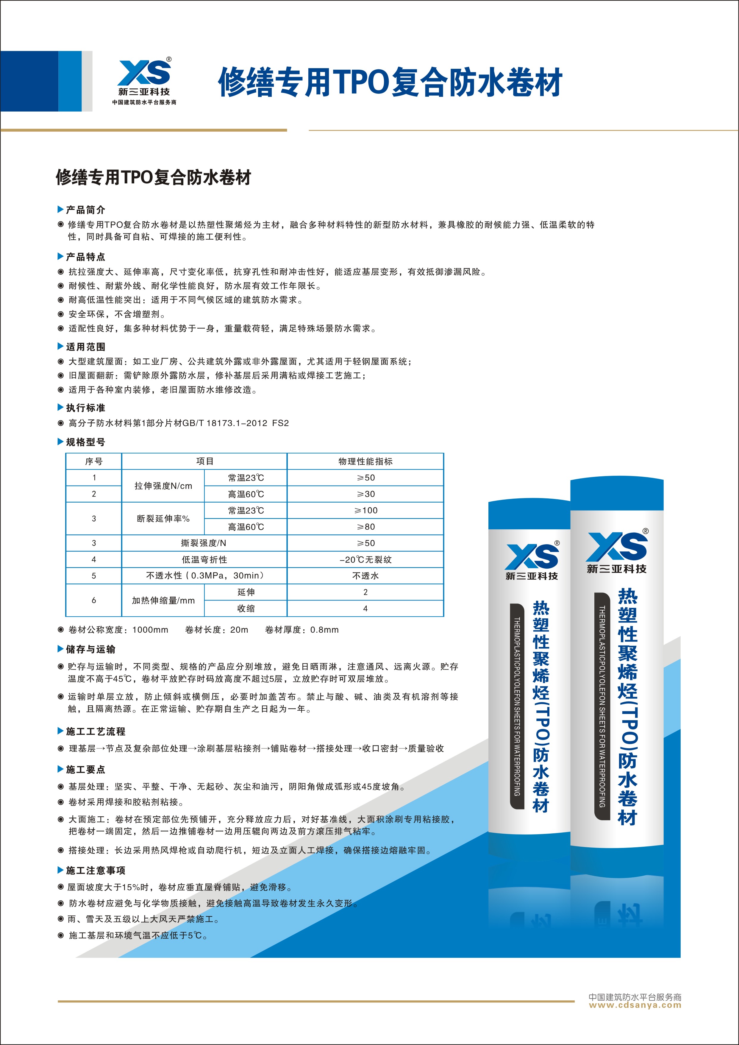 修繕專用TPO復(fù)合防水卷材是以熱塑性聚烯烴為主材,融合多種材料特性的新型防水材料,兼具橡膠的耐候能力強(qiáng)、低溫柔軟的特性,同時(shí)具備可自粘、可焊接的施工便利性。